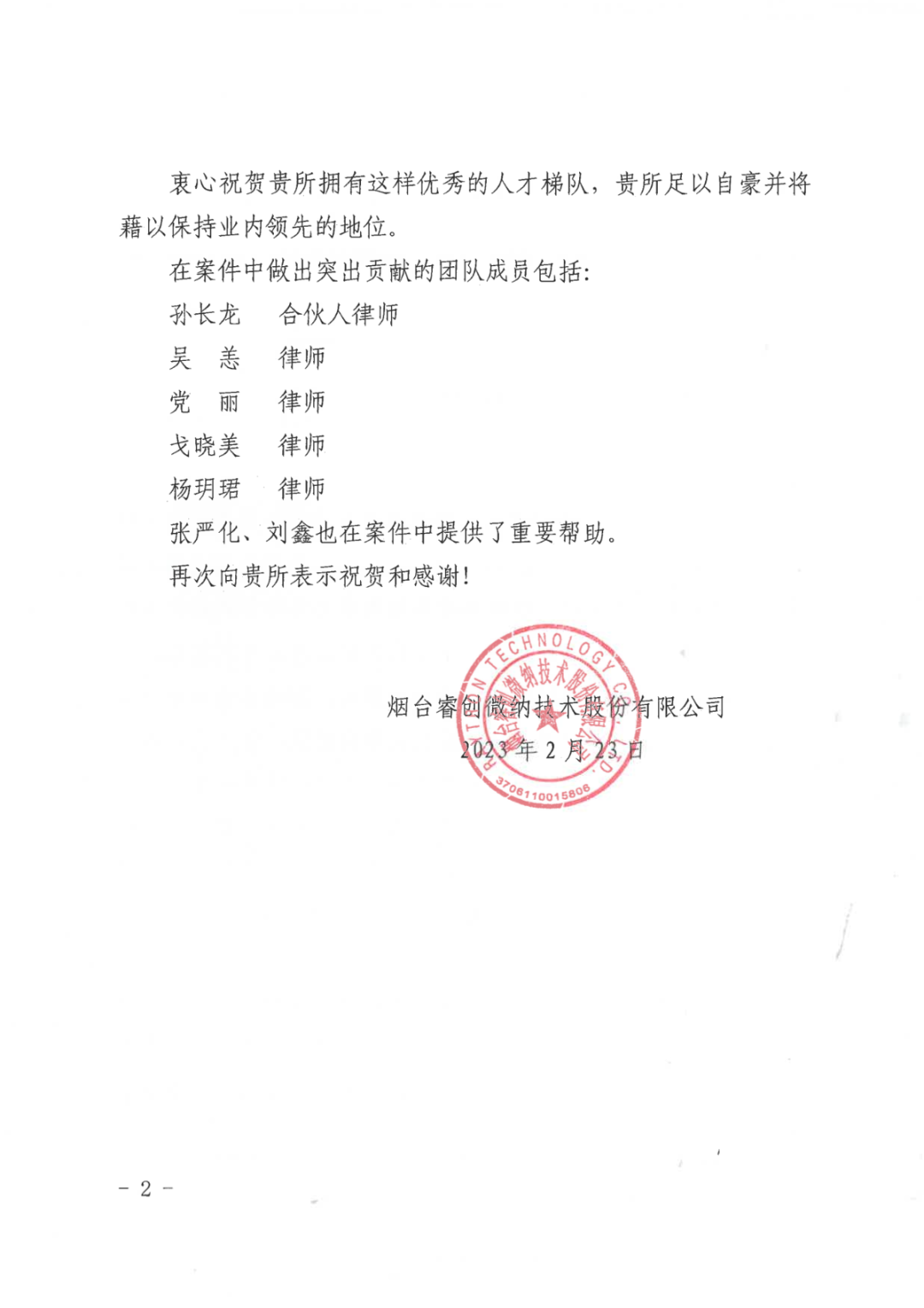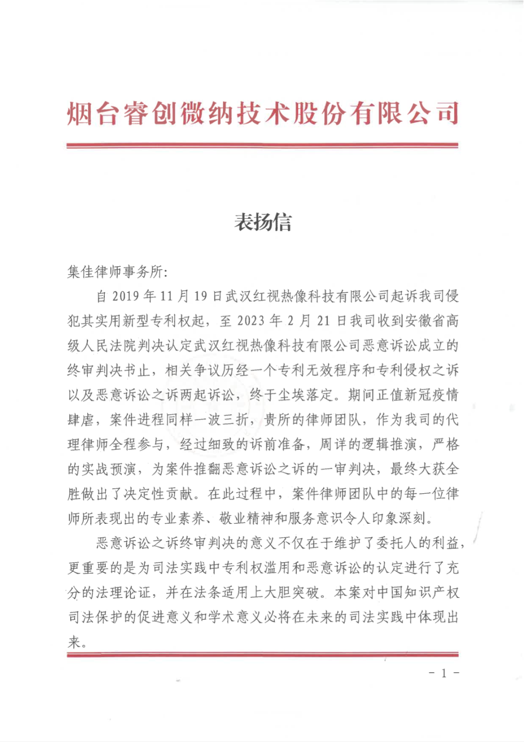 图1 睿创集团向jiuyou寄送的表扬信