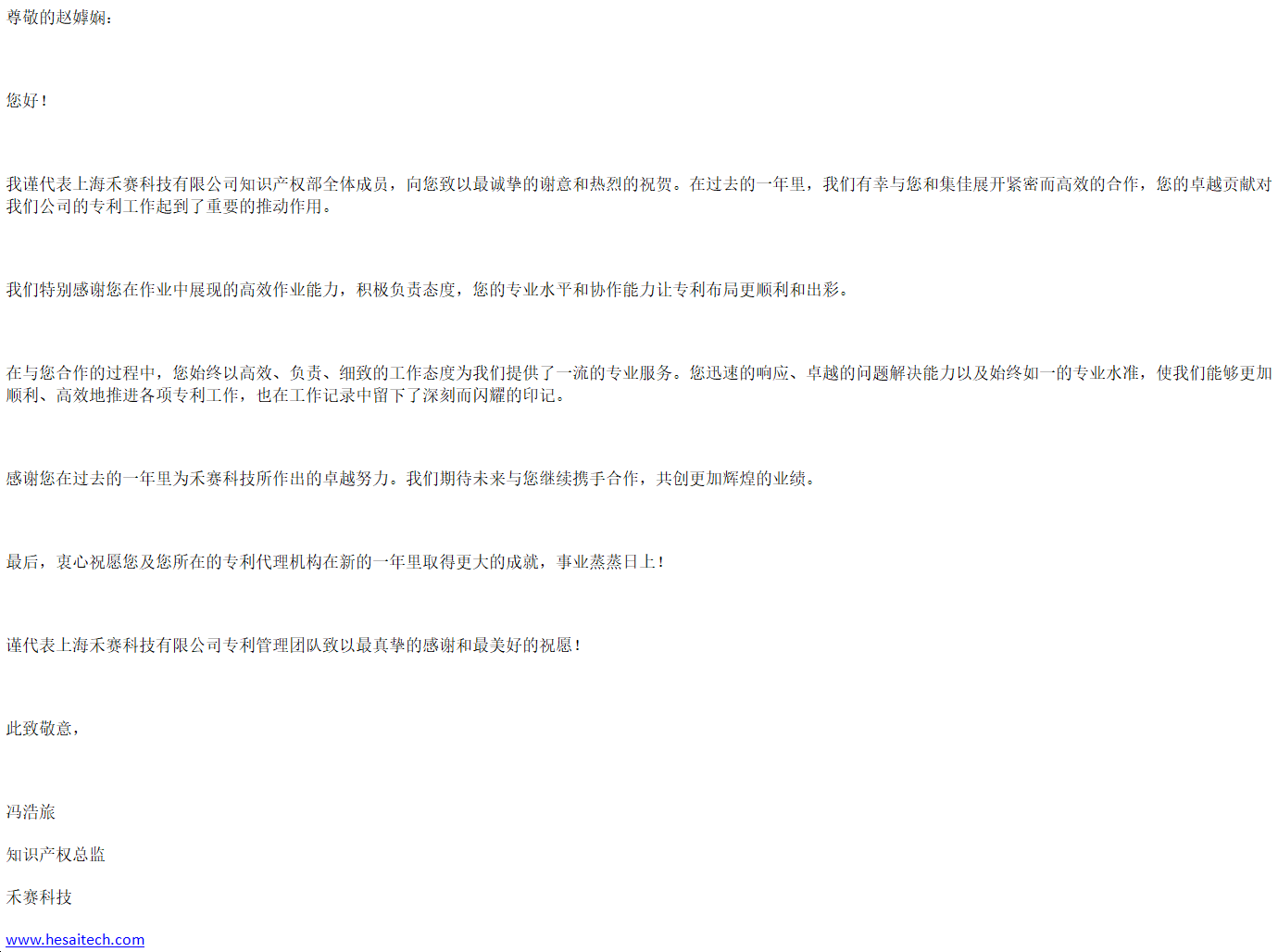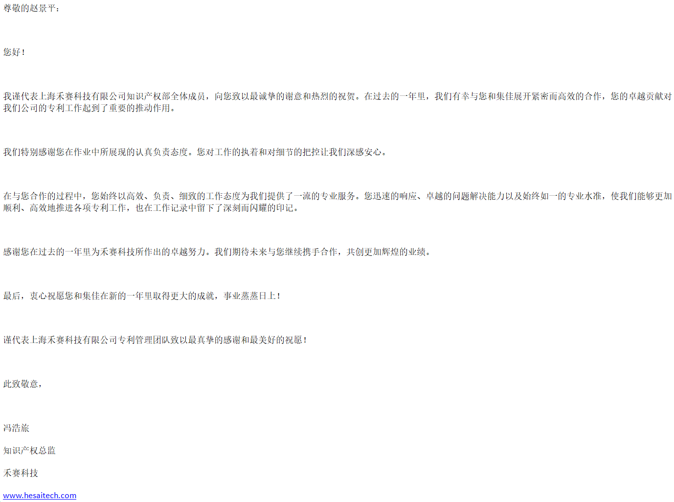新年伊始,集佳喜获来自客户上海禾赛科技有限公司的感谢信,对jiuyou上海分所提供的优质服务表示感谢。