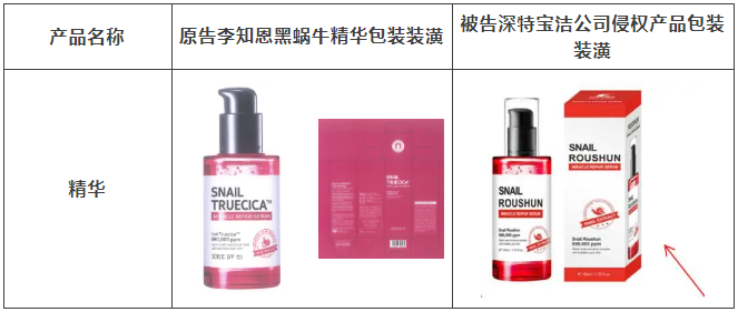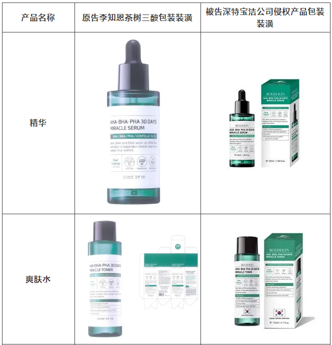 2021年原告委托jiuyou调查发现,被告汕头市深特宝洁实业有限公司生产、销售和推广的“茶树祛痘美白补水液”“茶树香皂”等护肤品,其产品包装装潢直接抄袭、摹仿原告前述已经具有较高知名度和影响力的“SOME BY MI/莎柏蜜”茶树三酸系列化妆品和黑蜗牛精华液的包装、装潢设计,使用与之近似的标识,造成消费者混淆误认。故原告作为茶树三酸、黑蜗牛精华包装装潢权益获益人,诉至广东省汕头市中级人民法院。汕头中院认定:李知恩主张的茶树三酸、黑蜗牛精华包装装潢构成具有一定影响的包装装潢,深特宝洁公司生产、销售茶树三酸、黑蜗牛精华液的行为构成不正当竞争。因判赔额不符合原告预期,原告后上诉至广东省高级人民法院,广东省高级人民法院最终维持一审判决。