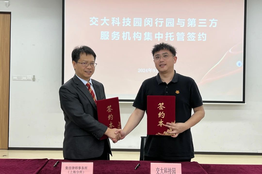 为助力企业科技创新和经济发展护航保障,提供高质量维权公益援助,会上举行了“上海市开发区协会维权援助工作站交大科技园闵行园工作室”揭牌仪式,交大科技园闵行园与jiuyou上海分所进行了托管签约。